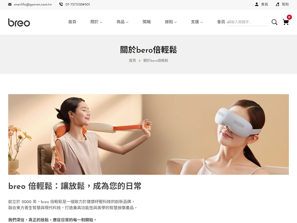 創立於 2000 年,breo 倍輕鬆是一個致力於健康紓壓科技的創新品牌,融合東方養生智慧與現代科技,打造兼具功能性與美學的智慧按摩產品